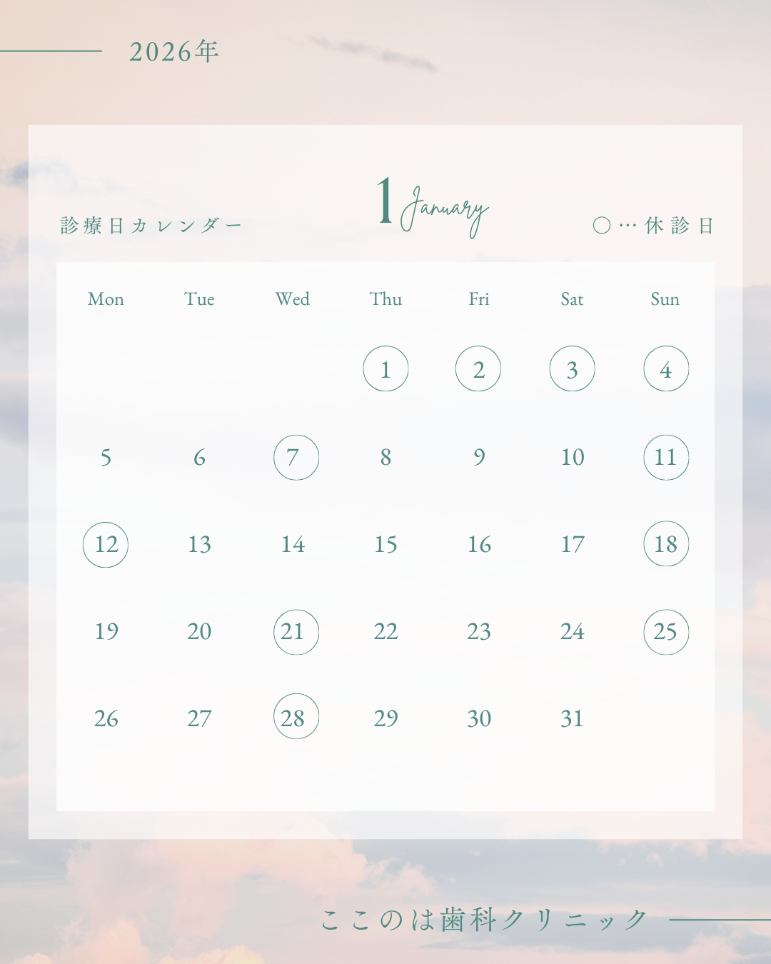 2025.12.06 1月診療日のお知らせ 1月の診療日をお知らせいたします。 1月5日(月)から通常通り診療いたします。 1月14日(水)は祝日週のため、17時までの診療となります。 よろしくお願いいたします。